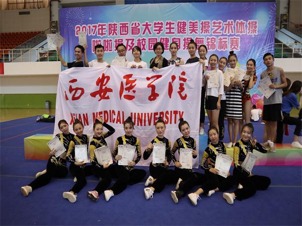 由陕西省教育厅主办,陕西省学生体育协会,西安邮电大学承办的2017年年陕西省大学生健美操艺术体操啦啦操锦标赛,于6月5日至6月7日在西安邮电大学长安校区体育馆隆重举行,来自全省42所高校42支队伍1000名运动员参赛。在我校体育部艺术教研室主任江艳平领队,教练员闫勇江,樊一婷老师的带领下。我校健美操队,参加了男子单人竞技,女子单人竞技,有氧踏板操,爵士啦啦操,以及民族健身操等比赛项目共24名运动员参加了本次比赛。在本次比赛中我校运动员积极向上,努力拼搏,在全省众多院校中脱引而出,又一次突破了历史,经过两天的激烈的预决赛最终我校女子单人竞技项目(郝珉)荣获第三名,男子单人竞技健美操(张世杰)荣获第七名,集体项目:有氧踏板操荣获第三名和第八名,爵士舞啦啦操荣获第三名,民族舞荣获第四名的成绩。