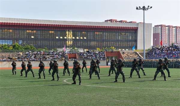 随后,参训学生进行了军事课目汇报表演,全面展示了14天来的训练成果。在指挥员的一声号令下,由我校3000多名新生组成的14个方阵依次经过主席台接受检阅,他们以整齐划一的队列展示着军事训练成果,以稳健有力的步伐传达出军人的坚毅气质,以高亢嘹亮的口号彰显着昂扬向上的西医风貌。接下来的汇报表演精彩纷呈,女子方阵展示了精彩的匕首操表演,男子方阵展示了沉着有力的擒敌术表演,承训教官们带来了战术动作和倒功操表演。