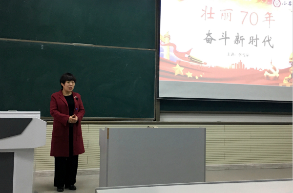 李雪萍副院长以《壮丽70年奋斗新时代》为题,从艰辛探索铸就辉煌历程、砥砺奋进谱写壮丽史诗、深刻启示引领前行之路三方面,阐释了新中国70年的辉煌历程、伟大成就、宝贵经验,解答了中国共产党为什么“能”、马克思主义为什么“行”,中国特色社会主义为什么“好”等重大问题,引导学生充分认识70年我们取得的一切成就是一代又一代中国人民持续奋斗的结果。