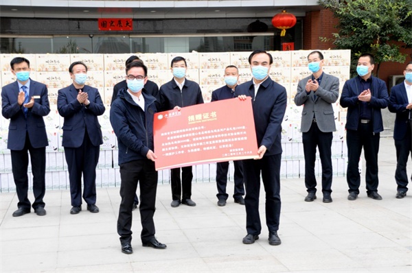 杨帆院长代表学校向百味园公司陈振总经理颁发了捐赠证书。张越林副院长宣读了学校感谢信,表示学校继续奋勇前行、打好防疫阻击战,回报社会各界对学校的厚爱。略阳县农业局曹敬轩局介绍了略阳气候特色、乌鸡养殖历史和丰富药用价值。百味园公司袁国强董事长介绍了公司生产的略阳乌鸡系列产品大礼包特色,谈到这是公司在前期向武汉火神山等医院捐赠价值50余万元后的再次捐赠,期望略阳乌鸡系列产品能帮助医务工作者和病患提高身体抵抗力,助力抗疫阻击战。