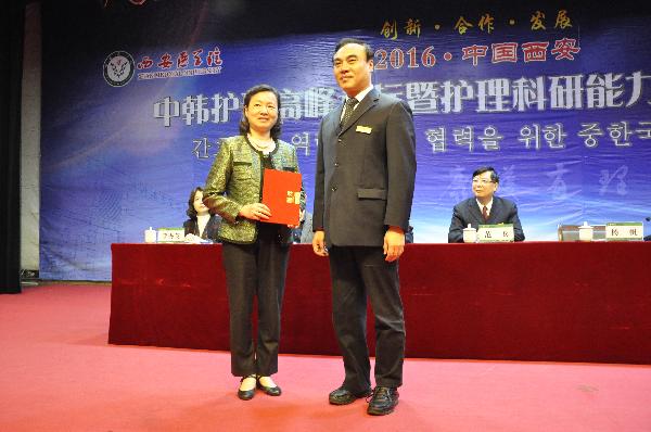 开幕式由副院长李雪萍、护理学院院长张永爱共同主持,院长杨帆代表学校致辞,他向中韩两国学者和嘉宾的到来表示热烈欢迎,并介绍了我校近年来坚持面向基层,培养应用型医药卫生人才的办学理念,在这种理念的指导下,我校护理专业现已成为陕西省护理人才的培养摇篮。他指出,本次论坛搭建了中韩护理学科的交流学术平台,希望以此为契机为我校未来学术研究和国际合作寻求新思路,共同为我国高等护理教育贡献智慧和力量。陕西省卫生与计划生育委员会主任孙振霖在讲话中强调,护理工作是医疗卫生事业的重要组成部分,希望通过本次论坛,广大护理同仁能深入交流、积极促进我省护理事业与国际接轨,促进人类健康发展。 陕西省护理学会理事长李武平主任对此次活动给予了充分肯定,他指出,陕西省护理学会始终弘扬“尊重知识,尊重人才”的风尚,长期与我校护理学院紧密合作,对基层、边远地区的护理人员进行帮扶教育。这次学习机会非常难得,希望护理人员在科学研究和特定的专业领域能够有所收获。随后,杨帆为与会的12位专家颁发了名誉教授聘书。