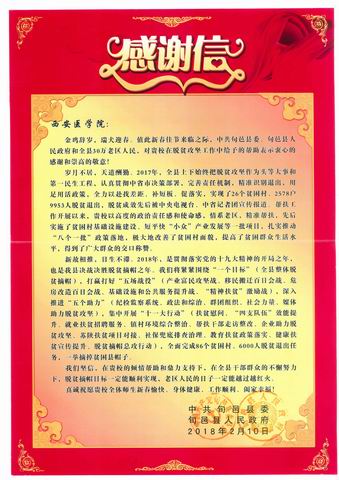 近日,中共旬邑县委、旬邑县人民政府向西安医学院发来感谢信,对西安医学院在脱贫攻坚工作中给予的支持和帮助表示衷心感谢,并对全校师生致以最诚挚的祝福。