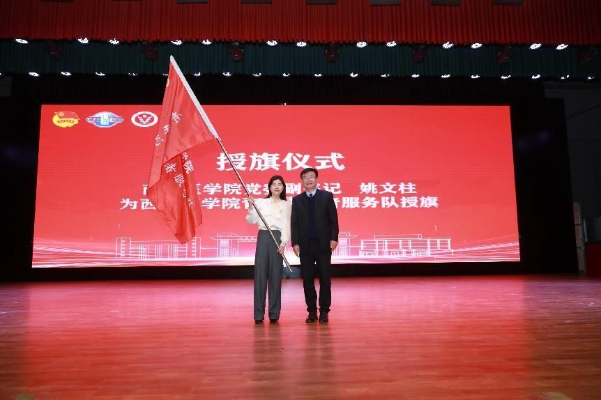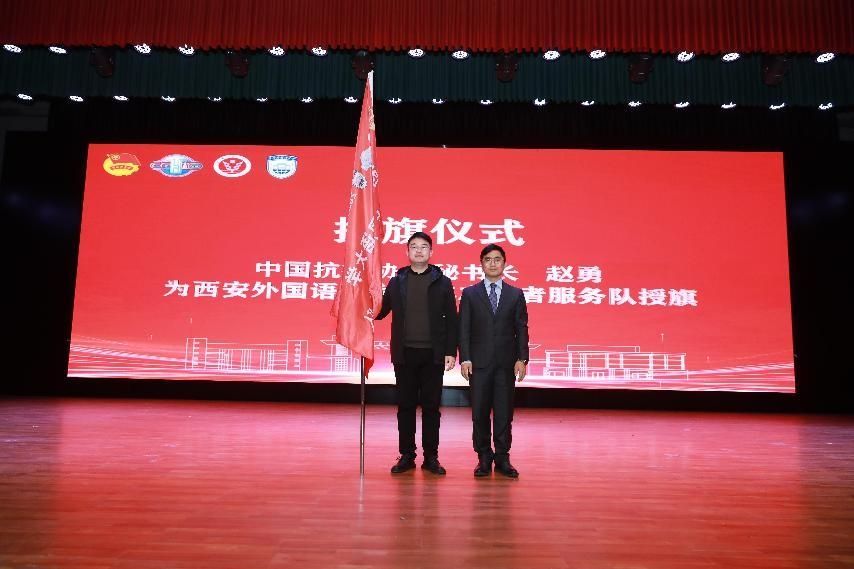 卫生管理学院学生赵泽远代表全体志愿者表态发言。姚文柱、赵勇分别为2024年中国整合肿瘤学大会西安医学院青年志愿者服务队、西安外国语大学青年志愿者服务总队授旗。