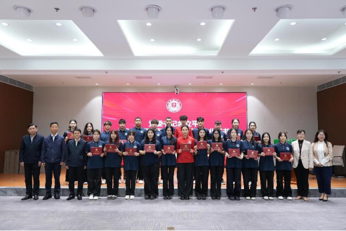 党委副书记杨卓虎宣读了2024级预科班学生结业名单。余立平为顺利结业的全体学生逐一颁发结业证书并合影留念。