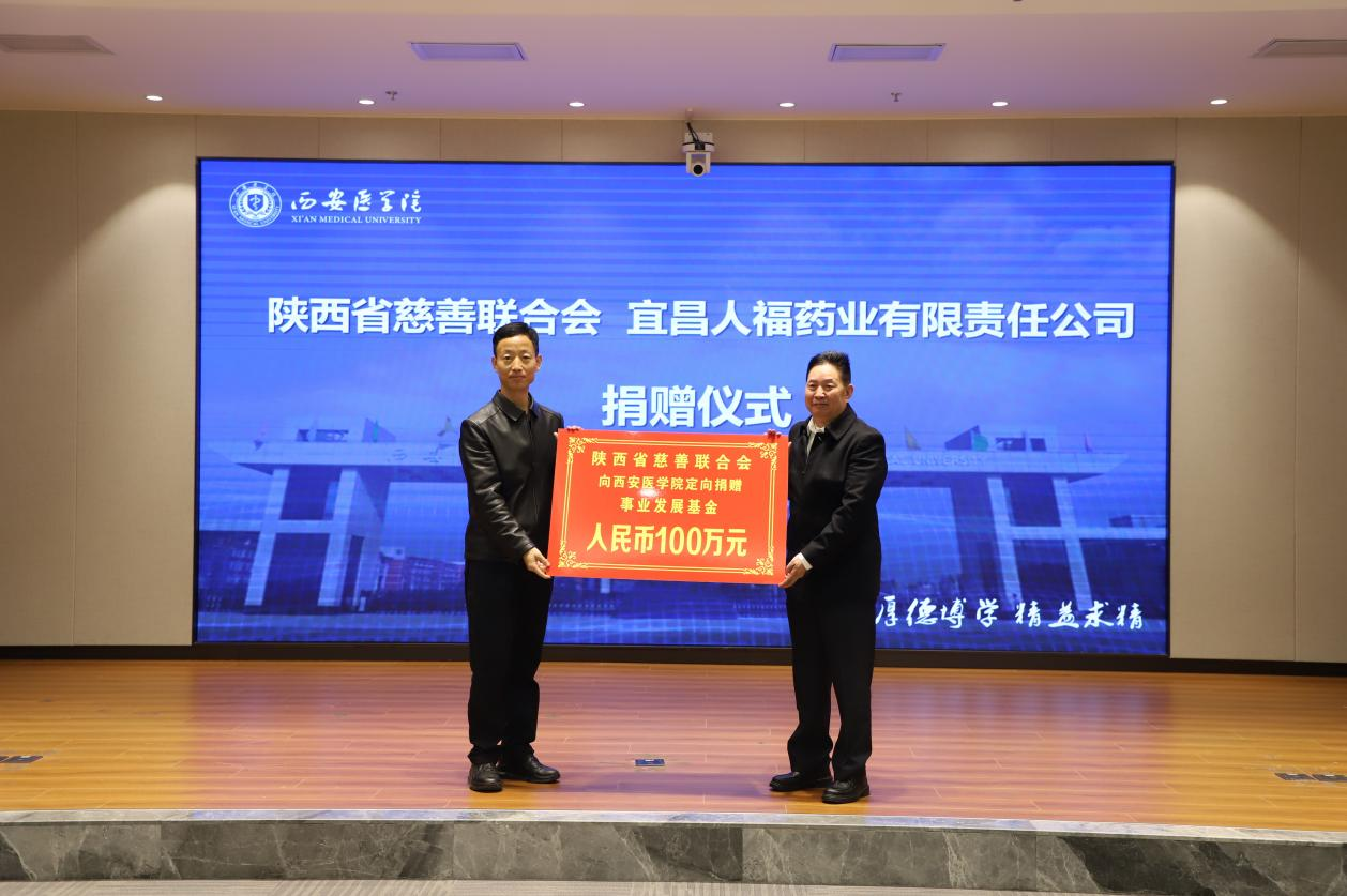 捐赠仪式上,巩守平代表学校对陕西省慈善联合会和宜昌人福药业有限责任公司对学校的支持表示感谢,介绍了学校的办学历程、育人成果以及“十五五”期间基于学科专业发展的师资队伍、人才培养、科学研究、社会服务等立德树人方面的重点工作。他强调,学校正处在深化改革、提升内涵、加快建设高水平医学院校的关键时期,需要社会资源支持相关学科专业建设。希望能够进一步深化与陕西省慈善联合会的交流互动,拓展与宜昌人福药业有限责任公司在多领域的务实合作,共同探索产学研协同创新的新路径,为“健康中国”、“健康陕西”建设贡献智慧和力量。