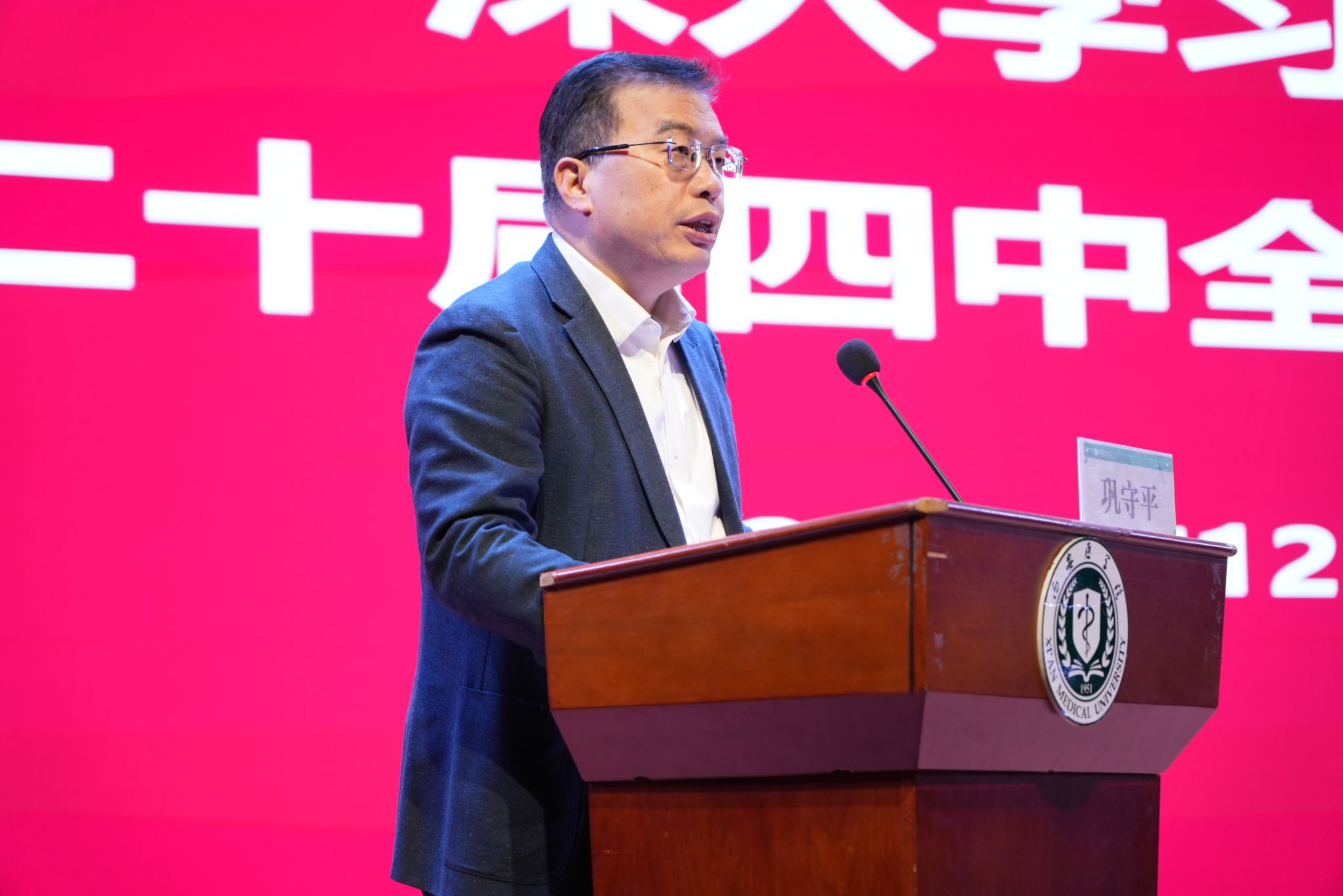 为深入学习领会、全面贯彻落实党的二十届四中全会精神,切实推动全会精神在学校落地落实,12月3日,校党委书记余立平以《学习贯彻落实二十届四中全会精神 为教育强省健康陕西建设做出新贡献》为题作专题宣讲。党委副书记、校长巩守平主持。全体校领导出席。