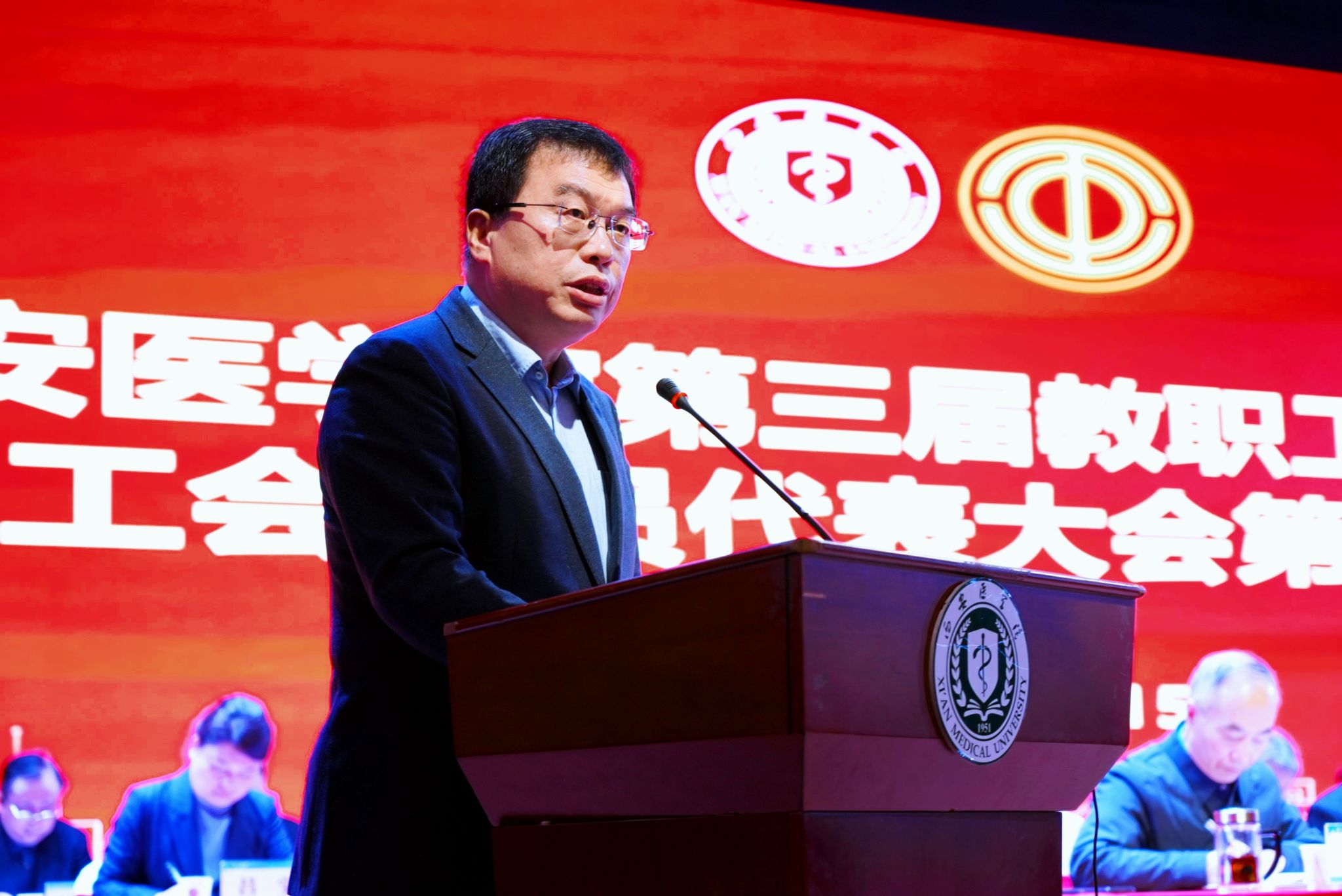 党委书记余立平致闭幕词。他指出,此次“双代会”是全校上下深入贯彻落实党的二十届四中全会精神和省委十四届九次全会精神、奋力推进学校“353”工作战略的关键时期召开的一次重要会议。他强调,围绕十年强校,建设教育强省版图的“西医板块”蓝图已确定,学校要积极构建以医学为主体,管理学、工学为支撑,文学、教育学为补充的发展格局,既要服务于医疗卫生事业,也要服务于生物医药产业,全校上下要把握好三年“窗口期”,持续深化改革,落实“135”工作举措,以务实的作风,将“大写意”变成“工笔画”,做勇担学校事业发展的追梦人。他要求,各级工会组织要当好桥梁纽带,各位代表要履行好职责,各级党政领导干部要强化责任担当,全体教职工要凝聚思想共识,以学校党委的统一部署为指引,上下一条心,开拓进取、扎实工作,共同开创西安医学院美好的明天。